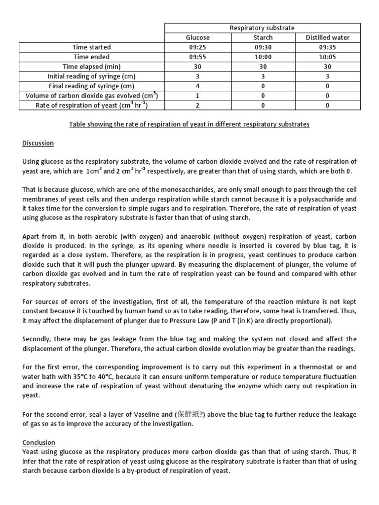 Photosynthesis - Screen 4 on FlowVella - Presentation ... from 91b6be3bd2294a24b7b5-da4c182123f5956a3d22aa43eb816232.ssl.cf1.rackcdn.com Lastly, in tube 4 there was little evolution of co2 this is because to respire, yeast must secrete amylase to break down the starch into glucose and not all yeast can produce amylase and even if they could this will take. Describe the role of yeasts in the production of bread and alcoholic what else do respiring yeast cells produce? Where does each of the three major parts of cell respiration take place in the cell? Respiration is the cellular process of releasing energy from food. We find that inhibiting respiration increases the expression of genes predicted to protect and metabolically. In yeast, the anaerobic reactions make alcohol, while in your muscles, they make lactic acid. Aerobic respiration releases fifteen times more energy than fermentation. Cell respiration in yeast 1.measure and add 1g of yeast into 4 of the test tubes.